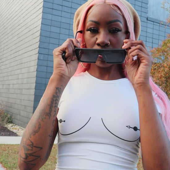 Available in white and black. Has some stretch, true to size. Model wearing size small.